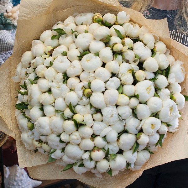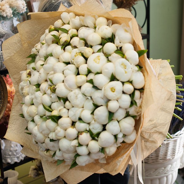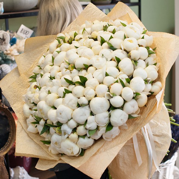 Большой букет из белых пионов в дизайнерской бумаге крафт.
