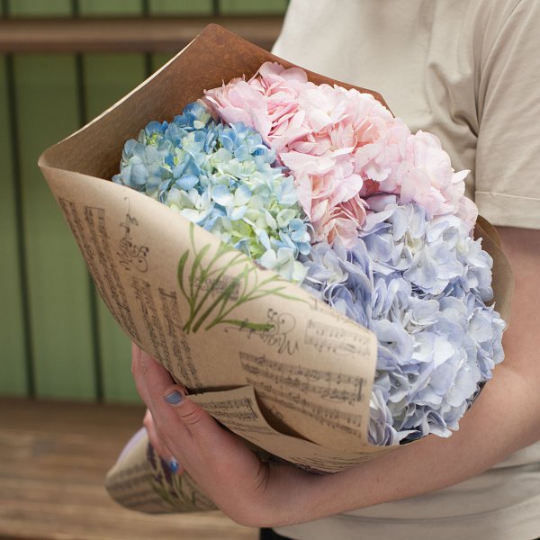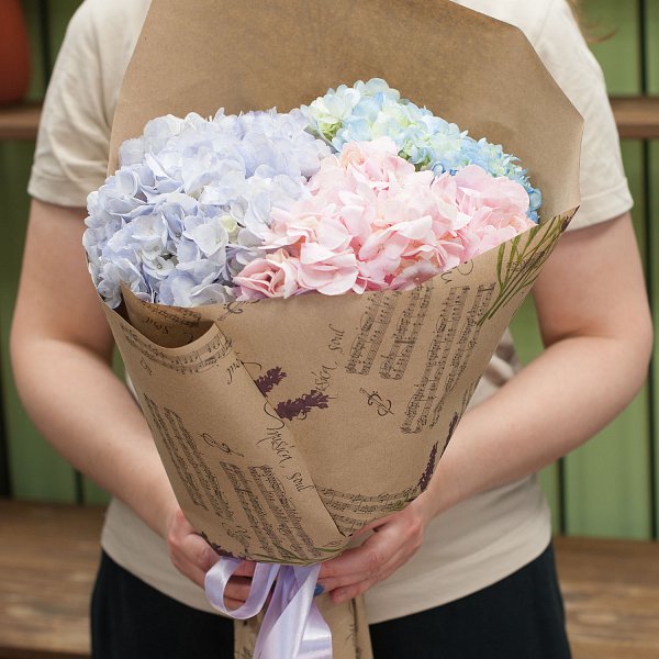 Букет из гортензий нежных тонов в бумаге крафт.