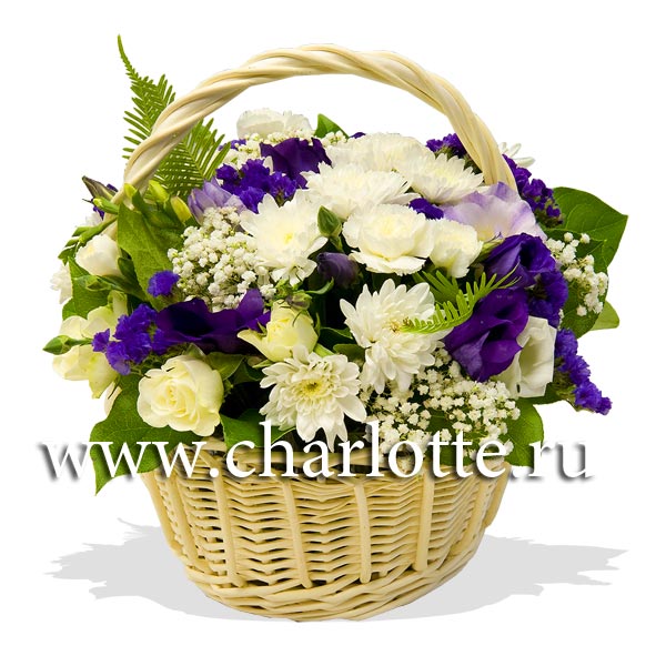 Корзинка в бело-сиреневых тонах. По Вашему желанию цветовую гамму композиции можно изменить, для этого звоните в наши салоны цветов или указывайте в разделе "комментарии для флориста" при заказе через интернет.