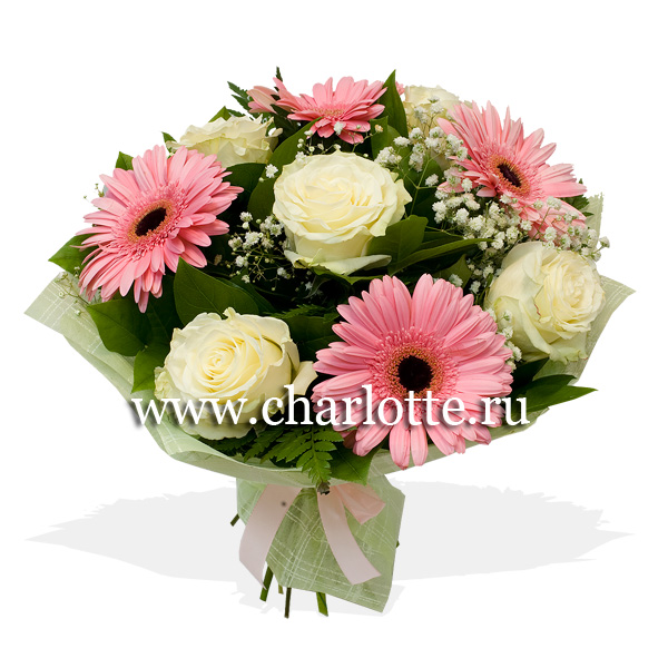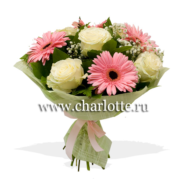 Букет в бело-розовых тонах из роз, гербер, гипсофилы с декоративной зеленью. По Вашему желанию цветовую гамму букета можно изменить, для этого звоните в наши салоны цветов или указывайте в разделе "комментарии для флориста" при заказе через интернет.