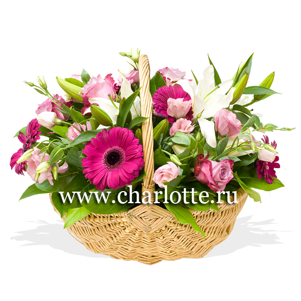 Корзина в бело-розовых тонах из лилий, роз, гербер, лизиантусов с декоративной зеленью. По Вашему желанию цветовую гамму корзины можно изменить, для этого звоните в наши салоны цветов или указывайте в разделе "комментарии для флориста" при заказе через интернет.