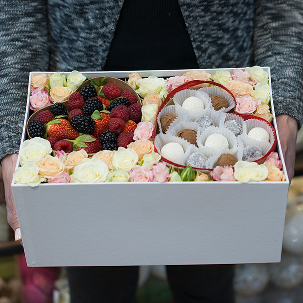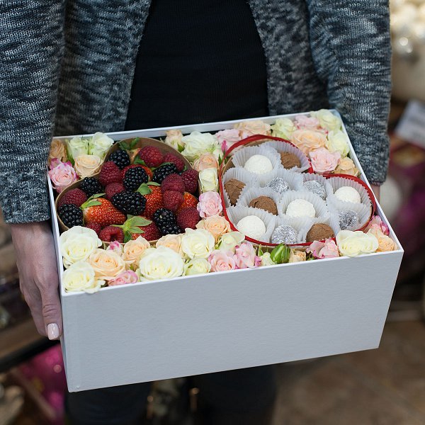 Коробка с ягодами: Клубника, ежевика, голубика, а так же французскими конфетами трюфелями, с кустовой розой нежных оттенков. По Вашему желанию состав композиции можно изменить, так же можно изменить цветовую гамму композиции, для этого звоните нашим операторам по телефону или указывайте в разделе "комментарии для флориста" при заказе через интернет.