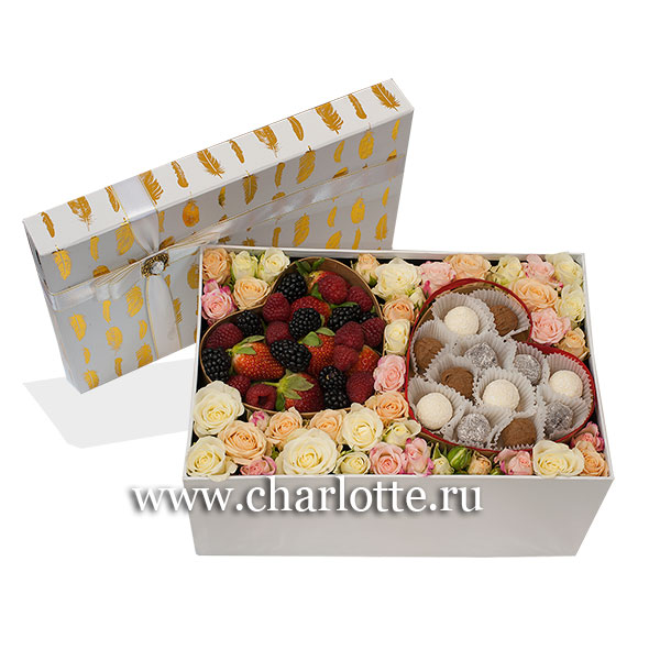 Коробка с цветами, ягодами и конфетами "Формула любви"(артикул 1375-C)