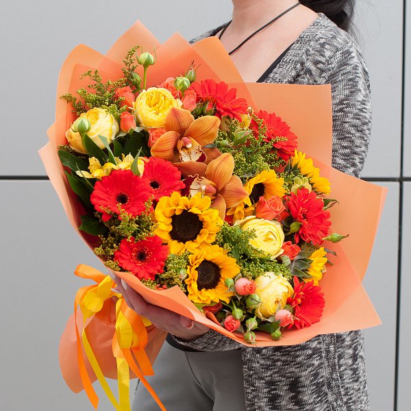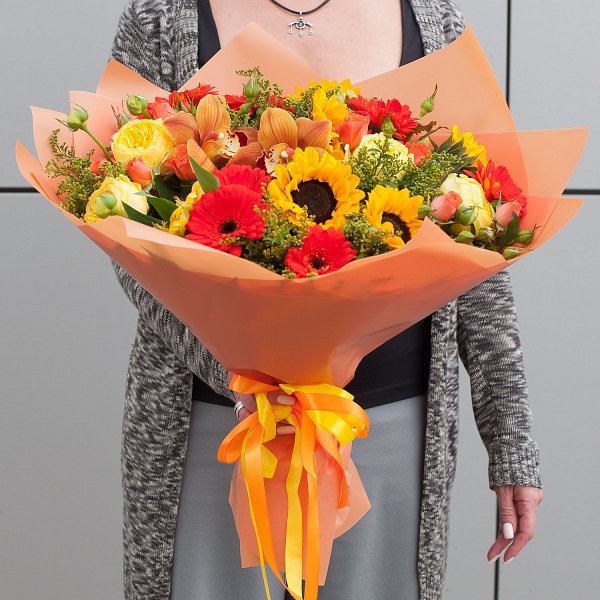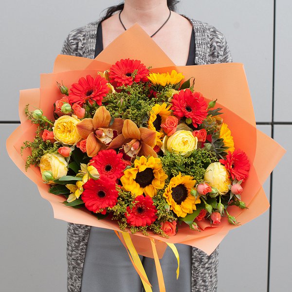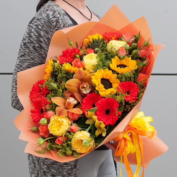 Букет выполнен в ярких осенних тонах, с преобладанием оранжевого и желтого цветов. В составе букета 29 различных цветов, включая минигерберы, орхидеи, кустовые пионовидные розы, солидаги, альстромерии и подсолнухи.