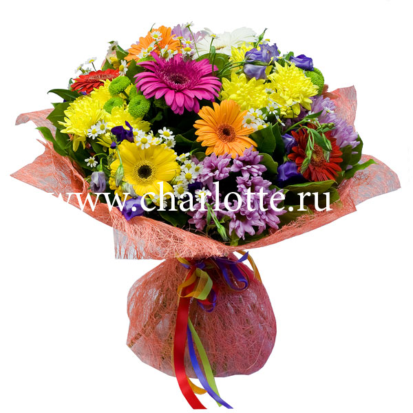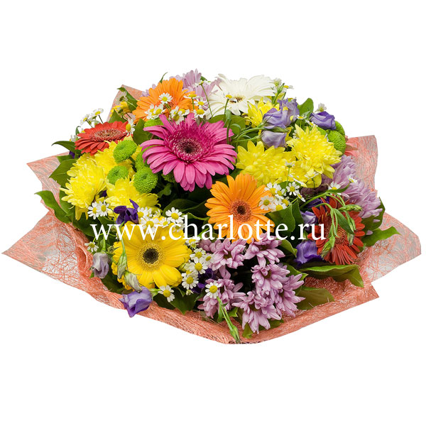 Яркий букет из гербер, хризантем, лизиантусов с декоративной зеленью в подарочной упаковке. По Вашему желанию цветовую гамму букета можно изменить, для этого звоните в наши салоны цветов или указывайте в разделе "комментарии для флориста" при заказе через интернет.