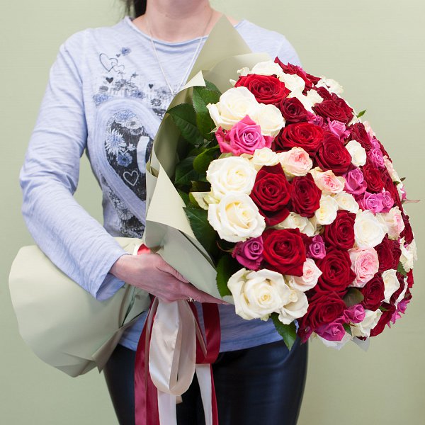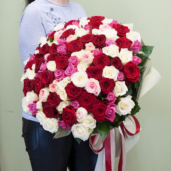 Большой букет из красных, белых, ярко-розовых, нежно-розовых роз в дизайнерской упаковке.
