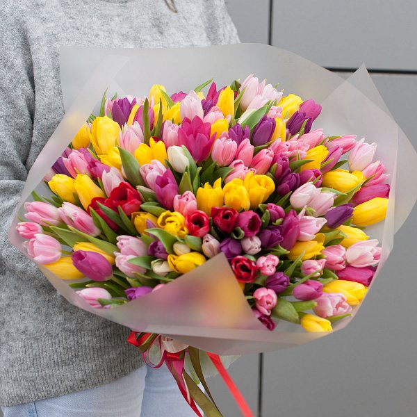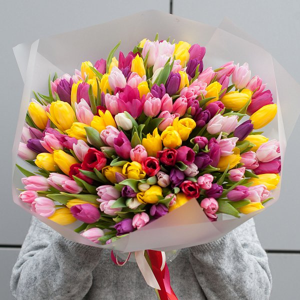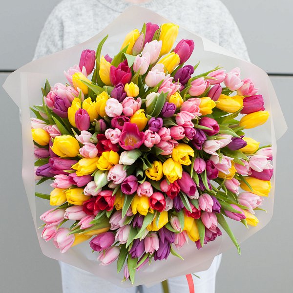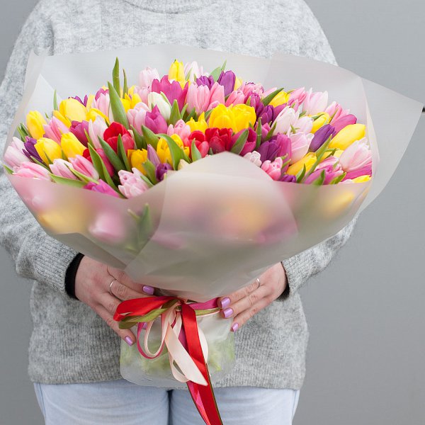 Букет состоит из 151 разноцветного тюльпана, что делает его ярким и запоминающимся.
