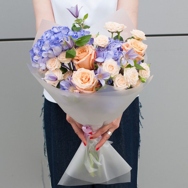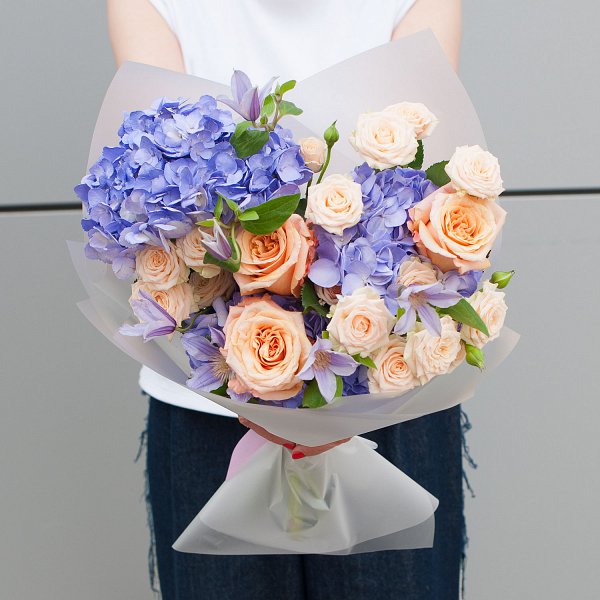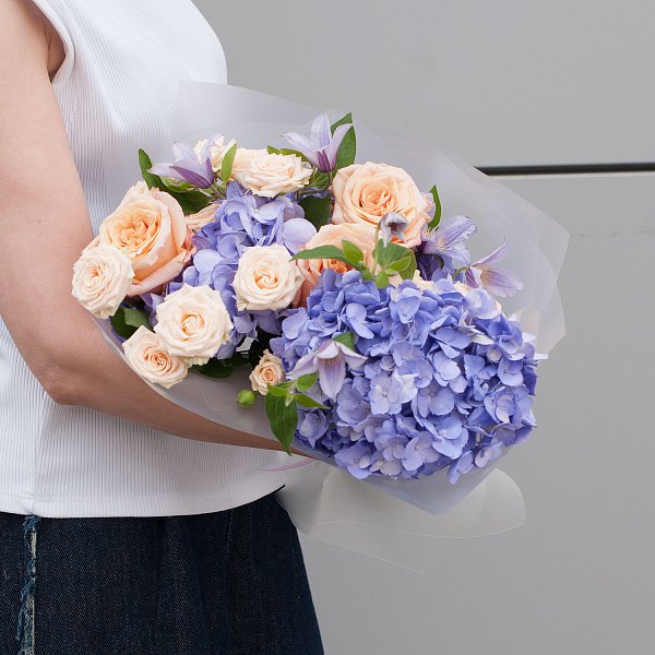 Букет состоит из 11 различных видов цветов, включая гортензию, розу, розу кустовую, клематис. Это позволяет создать гармоничную композицию, которая будет радовать глаз и вызывать приятные эмоции.