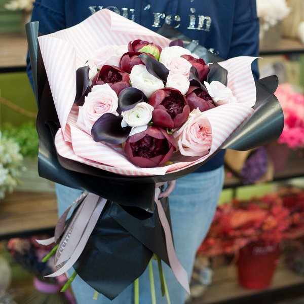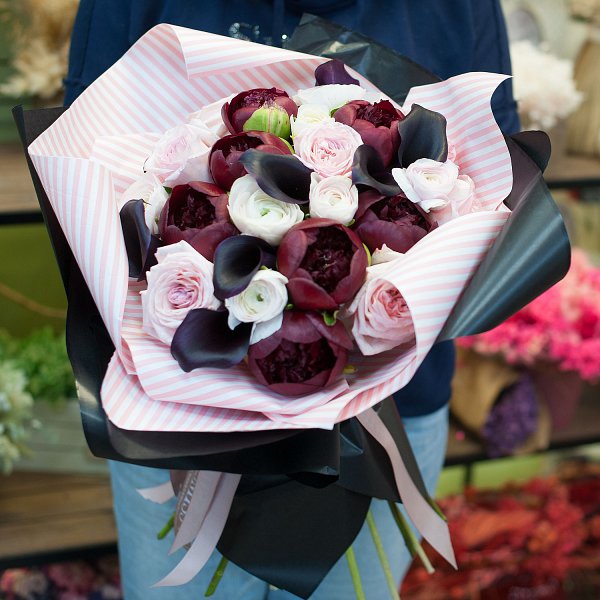 Букет состоит из бордовых пионов, темных калл, ранункулусов, роза пионовидная сорта Охара и лютика. Такое сочетание цветов создает неповторимый и яркий образ, который будет радовать глаз и вызывать улыбку на лице получателя.