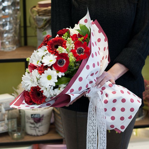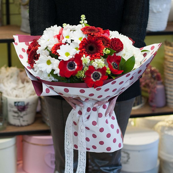 Букет цветов в красно-белой гамме из гортензий, сирени, ромашковой хризантемы, гермини, роз с декоративной зеленью в бумаге крафт.