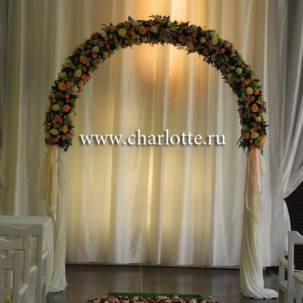 Арка для выездной регистрации. Из персиковых, кремовых и белых роз, вибурнума, гипсофилы с декоративной зеленью.