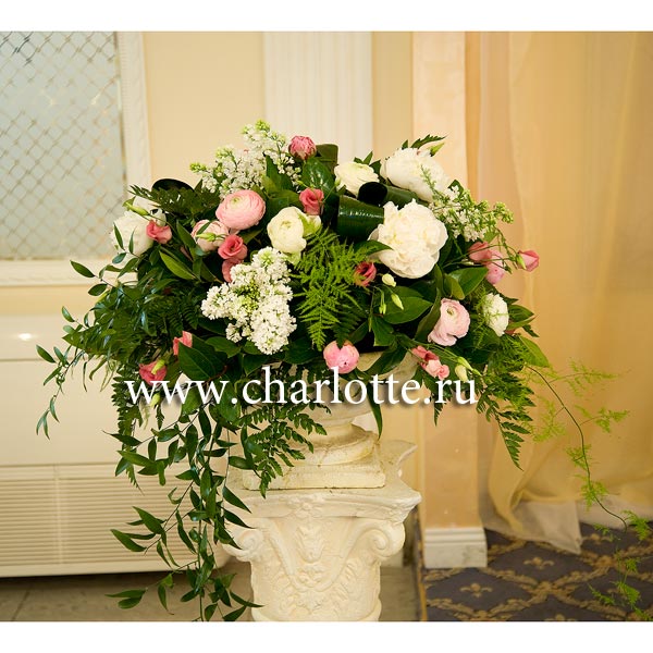 Композиция в бело-розовых тонах из белых и розовых пионов, белой сирени, розовых ранункулусов, лизиантусов с декоративной зелень.
