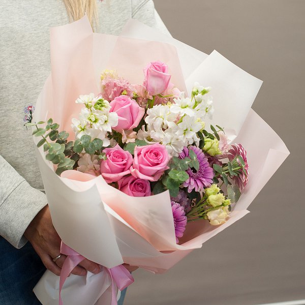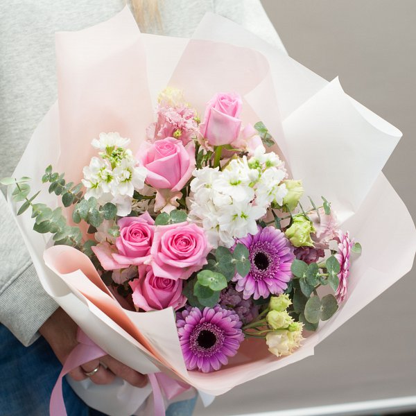Букет в розово-белой гамме из матиоллы, гермини, роз, эустом с деоративной зеленью в подарочной упаковке.