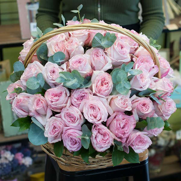 Корзина пионовидных роз "Охара"