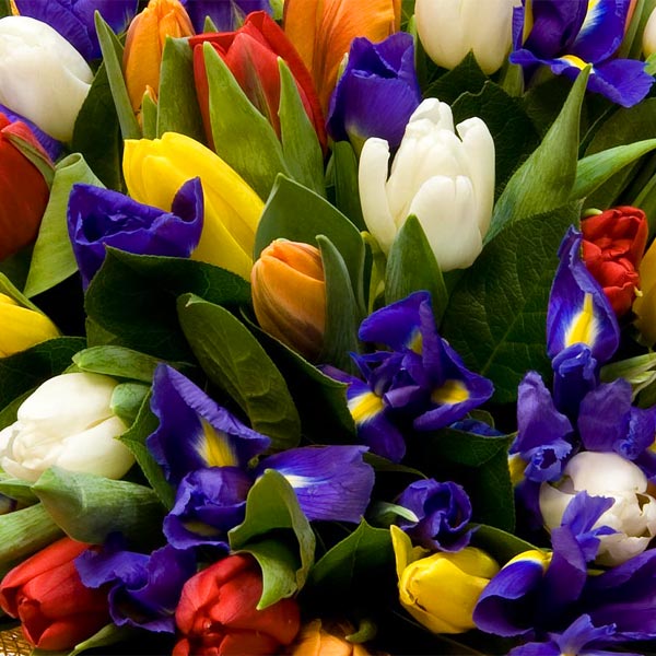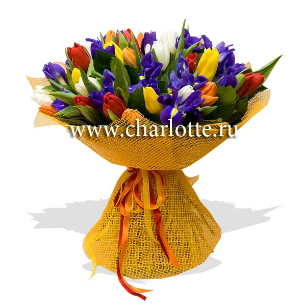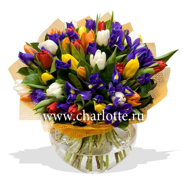 Букет из разноцветных тюльпанов и синих ирисов с декоративной зеленью в подарочной упаковке. Если Вы хотите изменить цветовую гамму букета, звоните в наш салон цветов или указывайте в разделе "комментарии для флориста" при заказе через интернет.