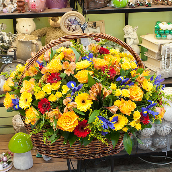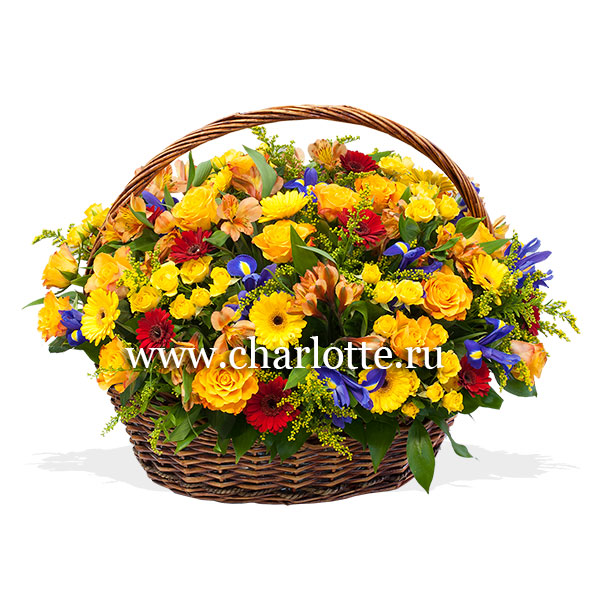 Корзина в ярких тонах из роз, альстромерий, гермини, кустовых роз, синих ирисов, солидаги с декоративной зеленью. По Вашему желанию цветовую гамму корзины можно изменить, для этого звоните в наши салоны цветов или указывайте в разделе "комментарии для флориста" при заказе через интернет.