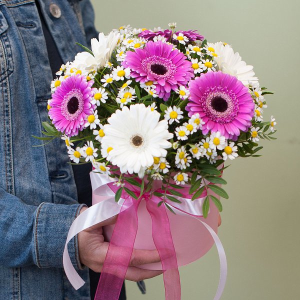 Букет состоит из двух видов цветов: ромашки кустовой и гербер мини. Эти цветы имеют нежный розовый оттенок, который придаст композиции свежесть и легкость.