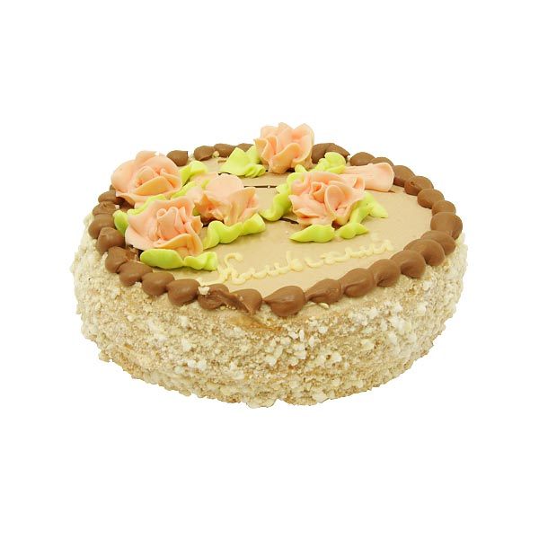 Воздушное безе с орехами прослоено сливочным кремом, украшен шоколадным сливочным кремом.