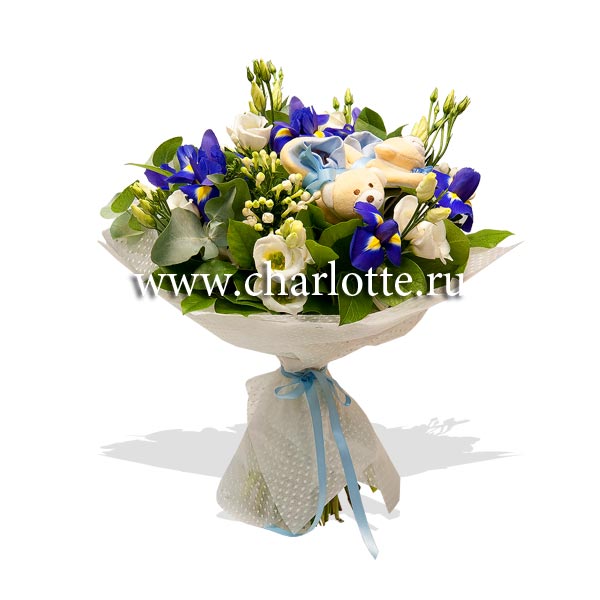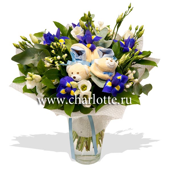 Букет в бело-голубых тонах из ирисов, лизиантусов, бовардии с декоративной зеленью в подарочной упаковке. В качестве декора - детские пинетки для мальчика.