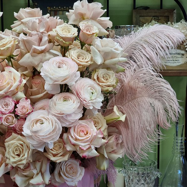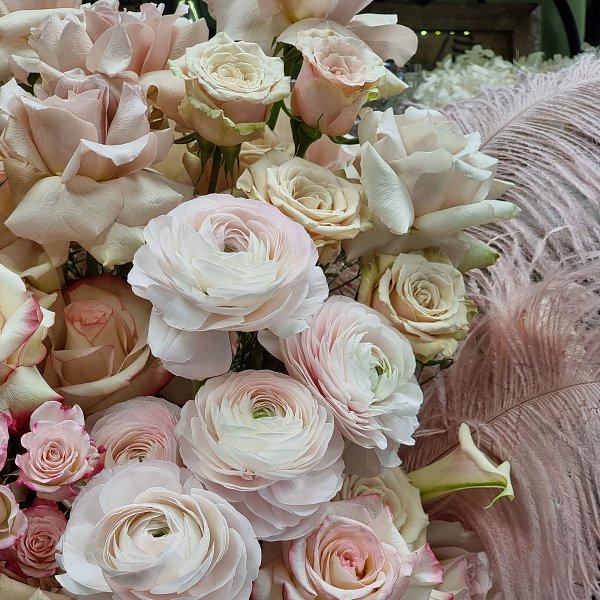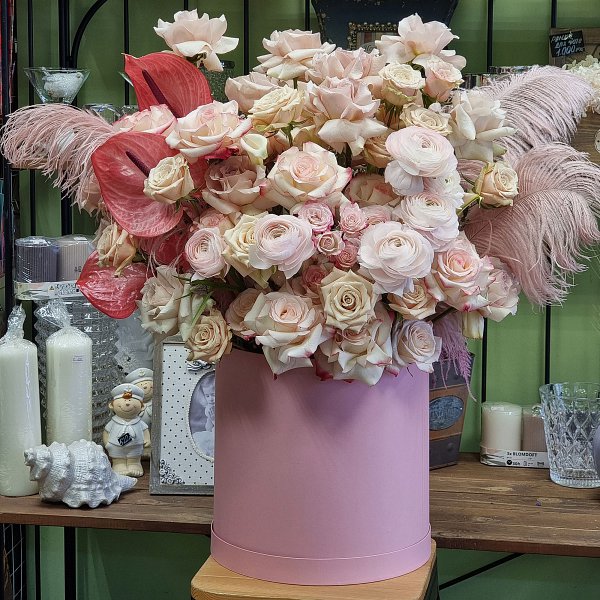 Шляпная коробка из множества роскошных цветов и декоративных эллементов в нежных тонах.