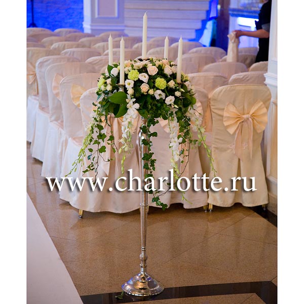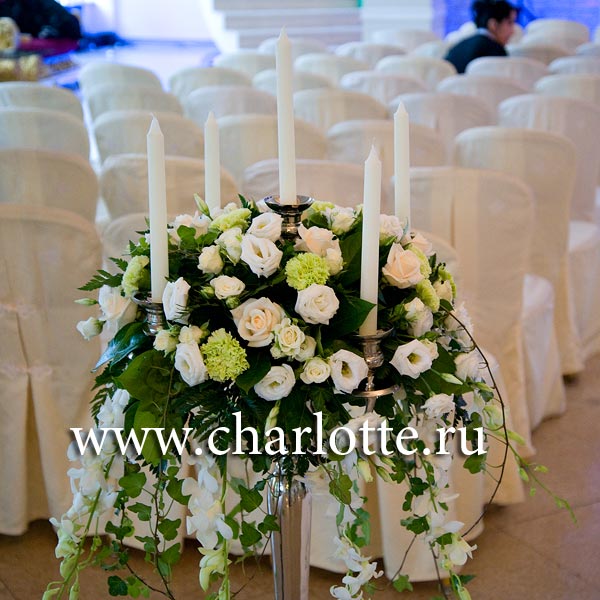 Композиция в кремово-зеленых тонах из кремовых роз, белых кустовых роз, зеленой гвоздики, белых лизиантусов, орхидей дендробиум с декоративной зеленью. По Вашему желанию цветовая гамма композиции может быть любой, для этого звоните в наш салон цветов.
