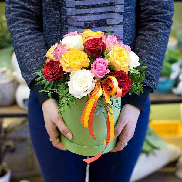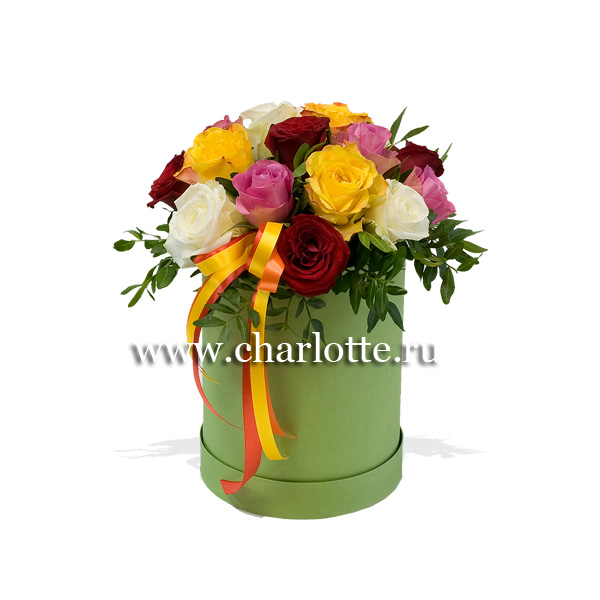 Композиция в ярких тонах из роз Кения с декоративной зеленью в подарочной коробке. По Вашему желанию цветовую гамму композиции можно изменить, для этого звоните в наши салоны цветов или указывайте в разделе "комментарии для флориста" при заказе через интернет.