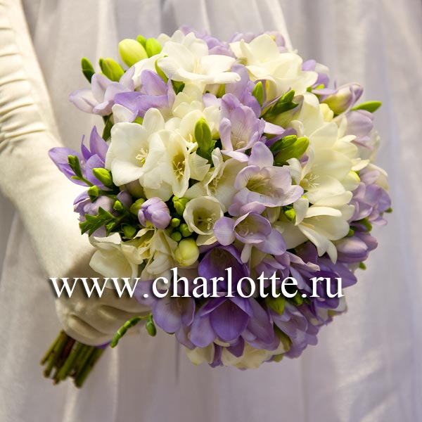 Букет невесты из белых и фиолетовых фрезий на портбукетнице. По Вашему желанию цветовую гамму можно изменить, для этого звоните в наши салоны цветов или указывайте в разделе "комментарии для флориста" при заказе через интернет. В этом букете невесты 50 фрезий.