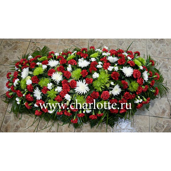 Траурный венок из красных одноголовых гвоздик, белых кустовых гвоздик, белых одноголовых хризантем, зеленых одноголовых хризантем с декоративной зеленью. Если Вы хотите изменить тона композиции, звоните нашим операторам по телефону или указывайте в разделе "комментарии для флориста" при заказе через интернет.