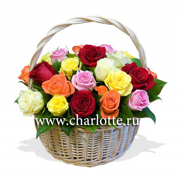 Корзина из разноцветных российских роз с зеленью. По Вашему желанию цветовую гамму композиции можно изменить, для этого звоните в наши салоны цветов или указывайте в разделе "комментарии для флориста" при заказе через интернет.