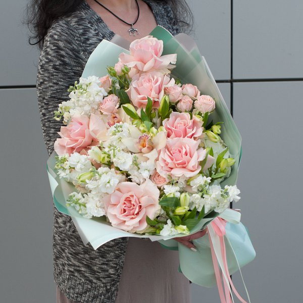 Букет состоит из 6 видов цветов: розы, орхидеи, альстромерии, пионовидной розы, маттиолы и гортензии. Такое разнообразие цветов создает неповторимый и яркий образ, который будет радовать получателя на протяжении долгого времени.