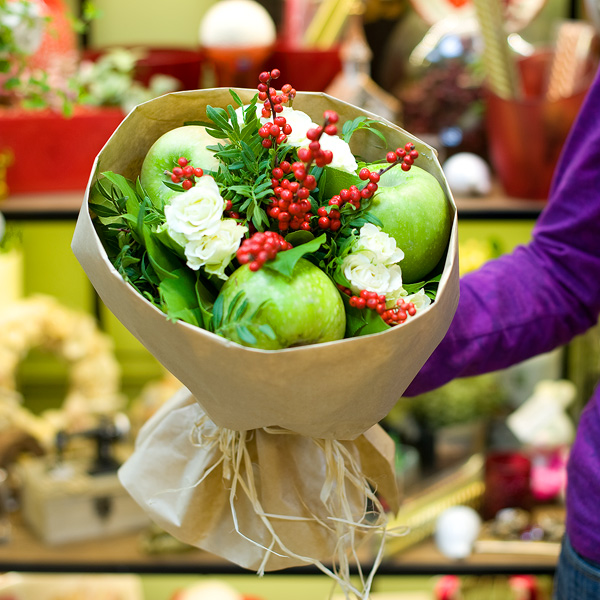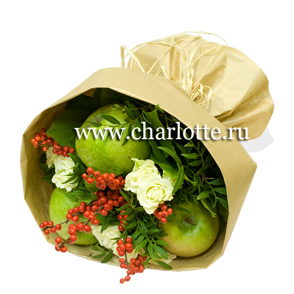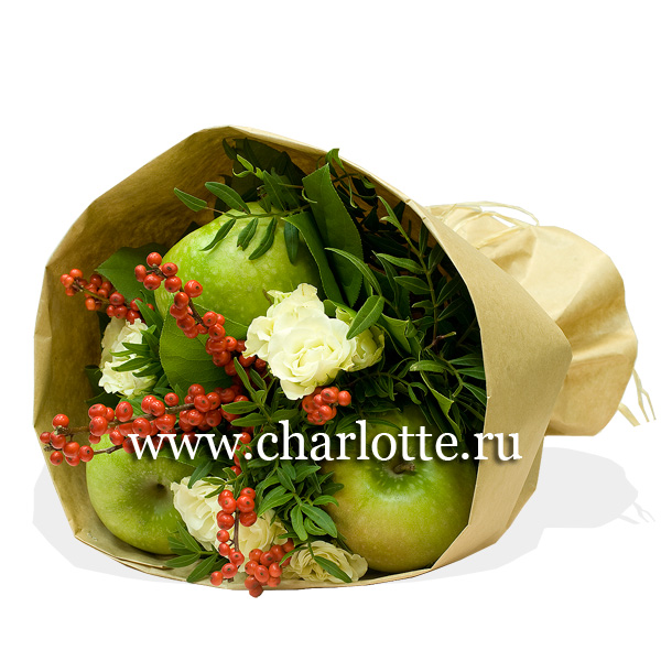 Фруктово-цветочный букет из зеленых яблок, илекса, кустовых роз с декоративной зеленью в крафте. По Вашему желанию состав букета можно изменить, для этого звоните в наши салоны цветов или указывайте в разделе "комментарии для флориста" при заказе через интернет.