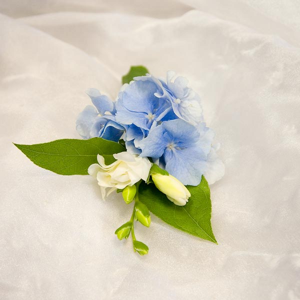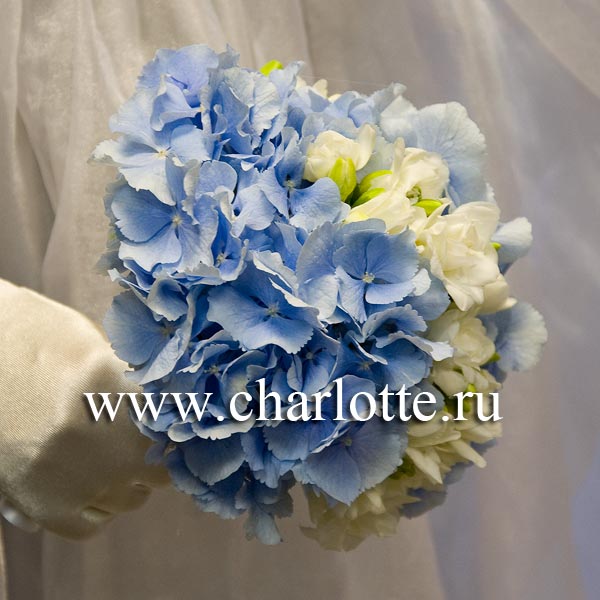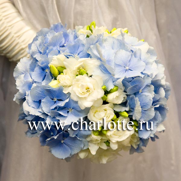 Букет невесты из голубой гортензии, белых фрезий с декоративной зеленью на портбукетнице. По Вашему желанию цветовую гамму букета можно изменить, для этого звоните в наш салон цветов или указывайте в разделе "комментарии для флориста" при заказе через интернет.