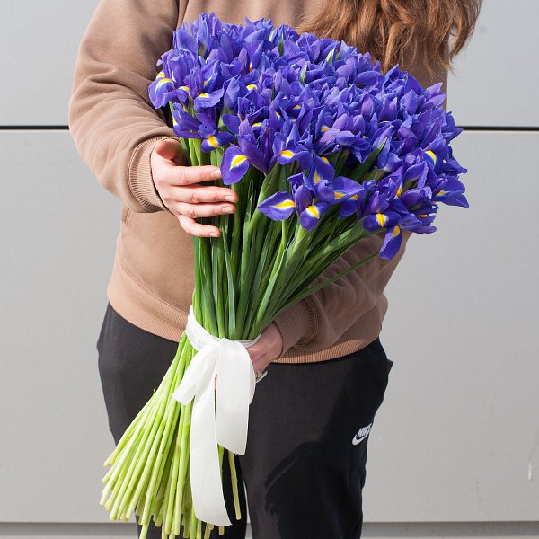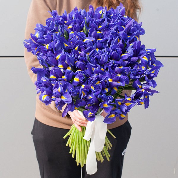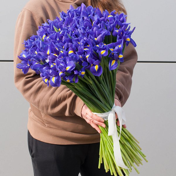 Букет состоит из 101 ириса, что делает его ярким и запоминающимся. Ирисы синего цвета, что придает букету глубину и насыщенность.