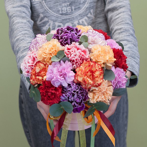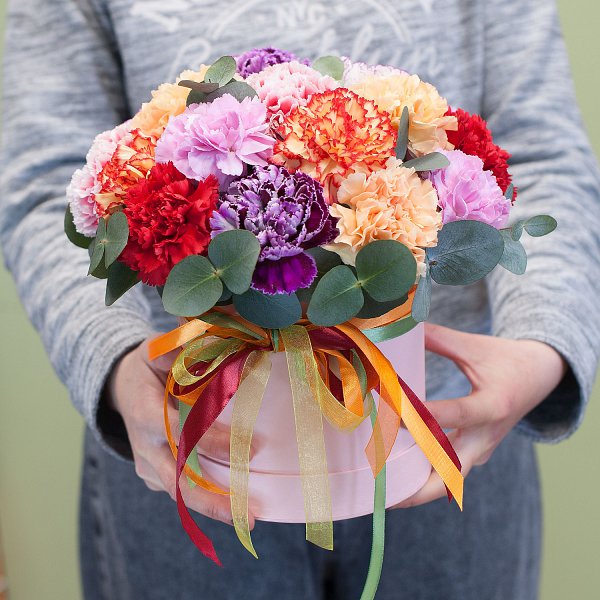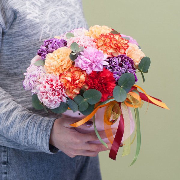 Коробка из разноцветных гвоздик с эвкалиптом в подарочной коробке с лентами.