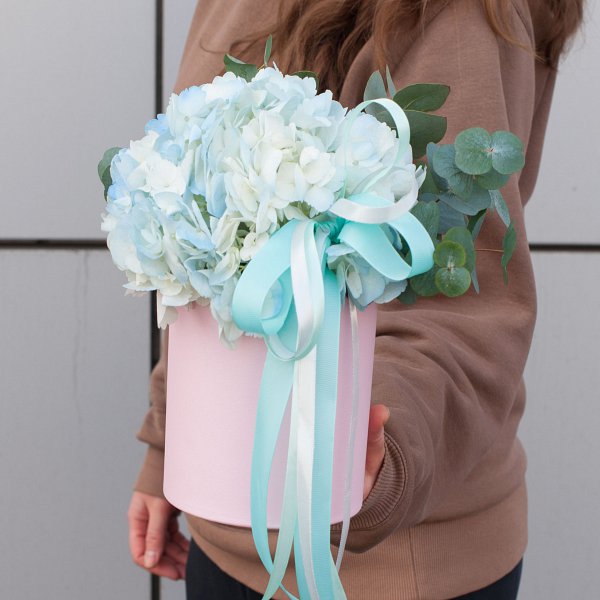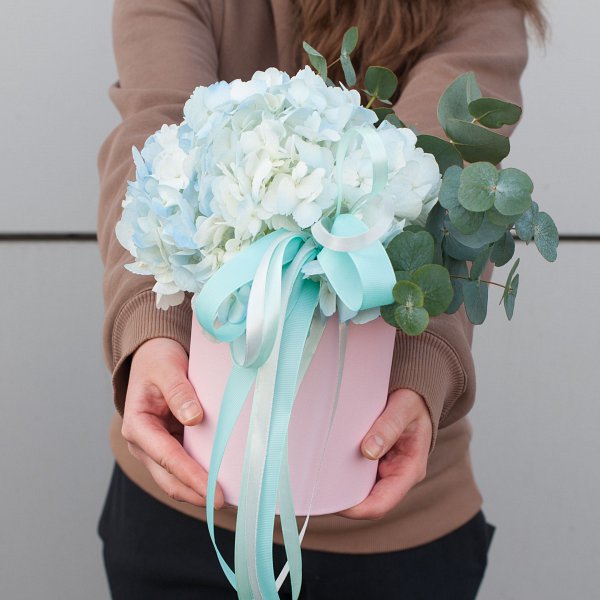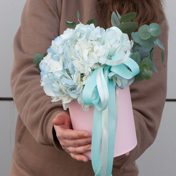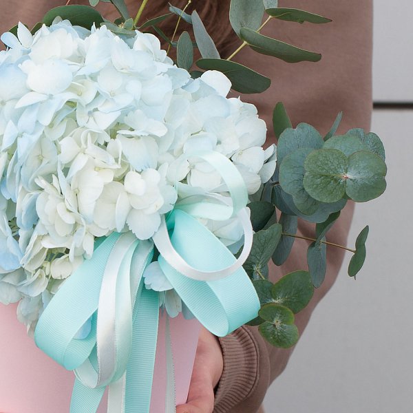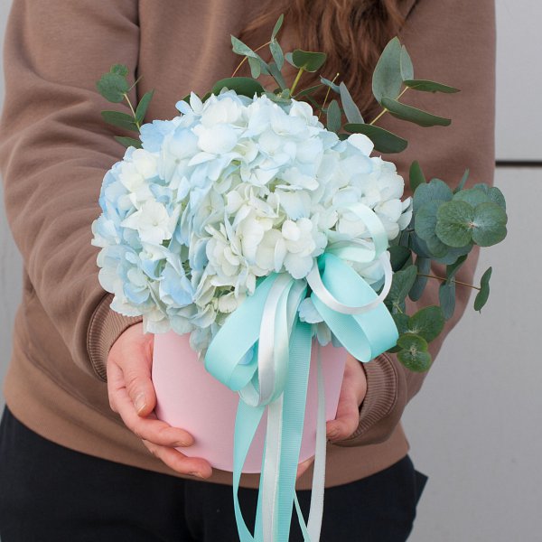 Особенностью данной композиции является использование гортензии голубого цвета. Этот цветок символизирует нежность и любовь, что делает его прекрасным выбором для подарка на День матери или День рождения.