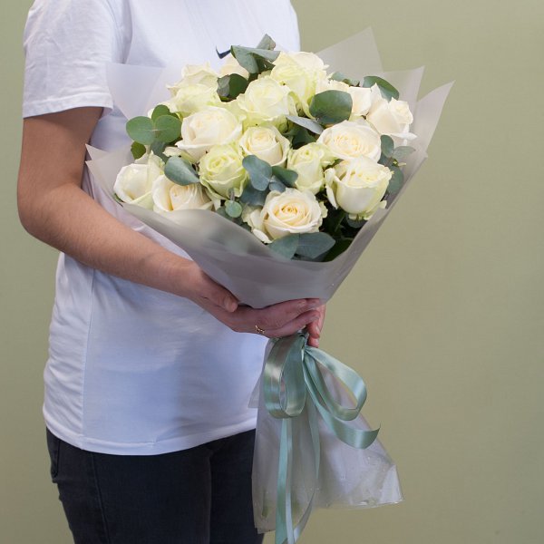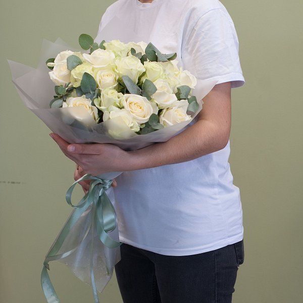 Букет из белых роз с эвкалиптом в дизайнерской упаковке.