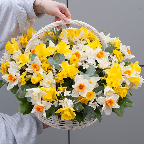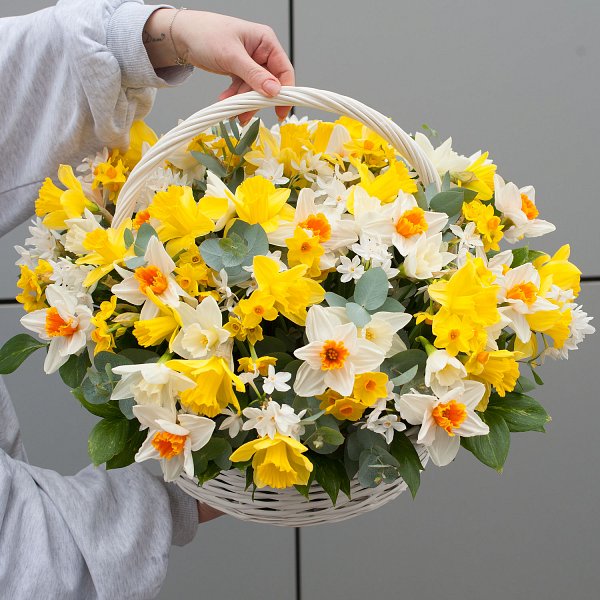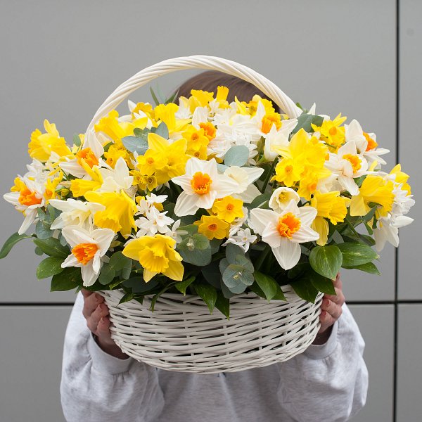 Цветочная композиция выполнена в виде корзины, что придает ей особый шарм и элегантность. Корзина с нарциссами станет отличным подарком для любого человека, будь то бабушка, деловой партнер, любимая, мама, коллега или ребенок.
