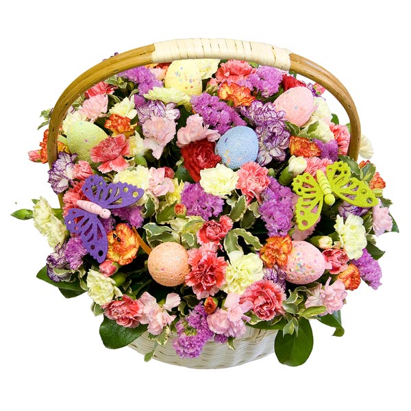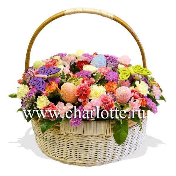 Корзина из разноцветных кустовых гвоздик, статицы с декоративной зеленью и пасхальным декором. По Вашему желанию цветовую гамму можно изменить для этого звоните в наши салоны цветов или указывайте в разделе "комментарии для флориста" при заказе через интернет.
