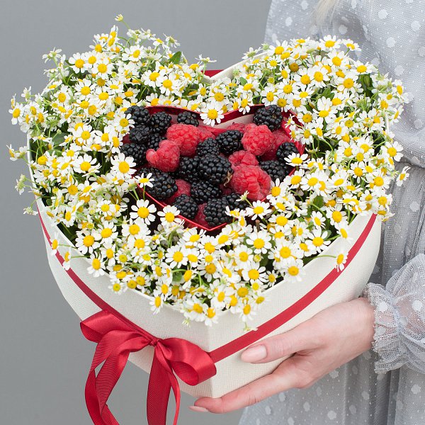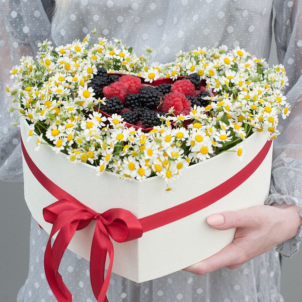 Коробка с кустовыми ромашками, малиной и ежевикой "Любимый июль" - это композиция в коробке, которая станет отличным подарком для любого случая.