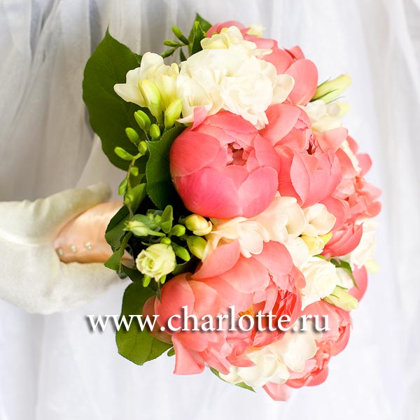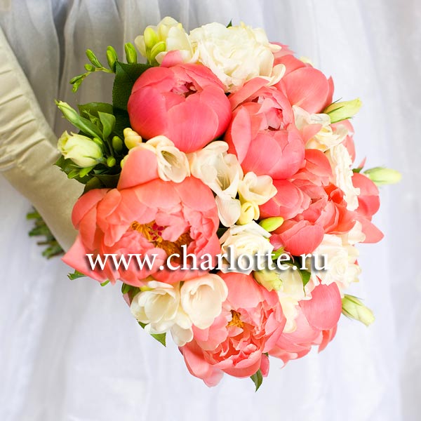 Букет невесты из коралловых пинов, кустовых роз, фрезий с декоративной лентой. По Вашему желанию цветовую гамму букета можно изменить, для этого звоните в наши салоны цветов или указывайте в разделе "комментарии для флориста" при заказе через интернет.