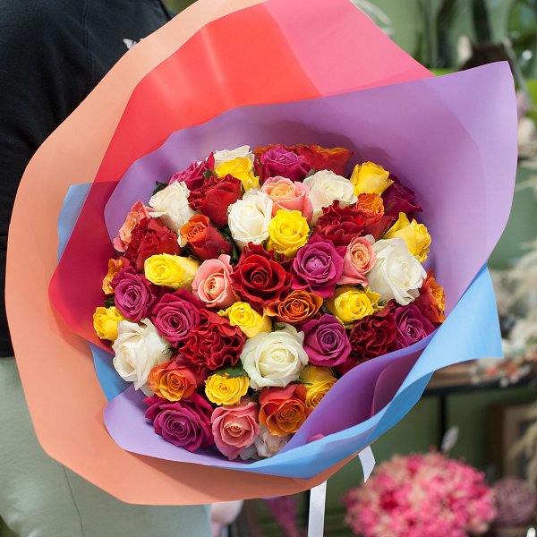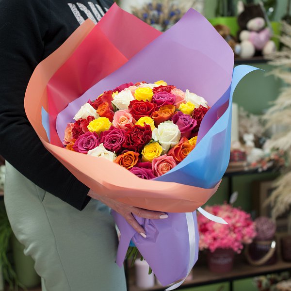Букет из разноцветных роз в дизайнерской упаковке.