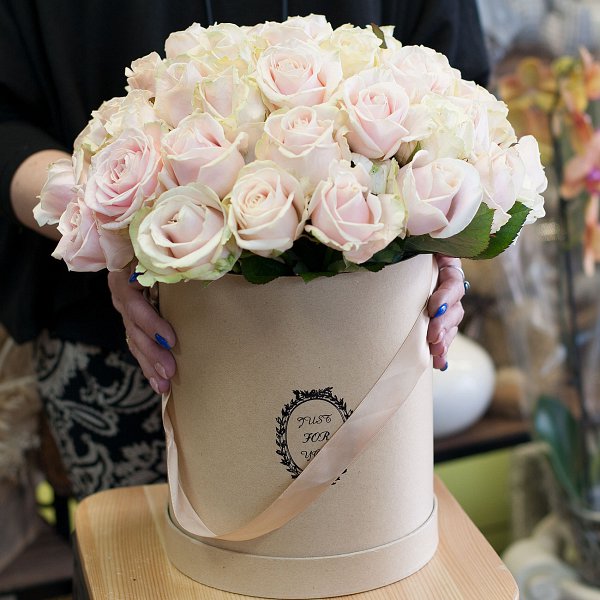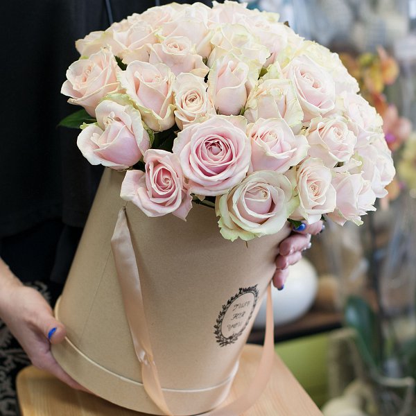 Шляпная коробка с нежно-розовыми розами.