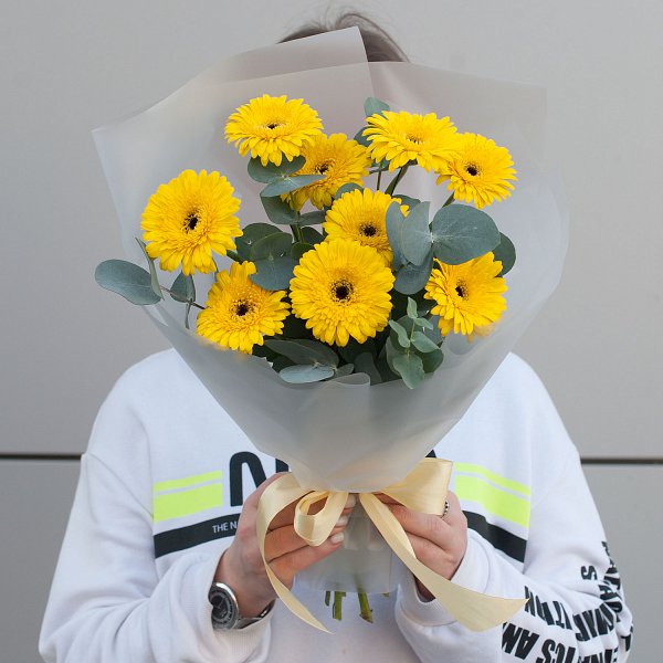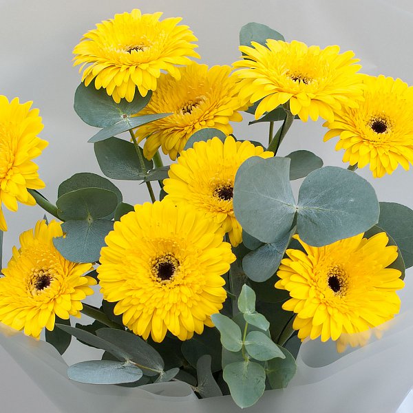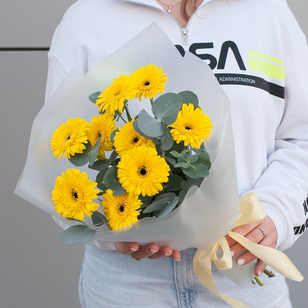 Букет состоит из 9 минигербер желтого цвета, что придает ему неповторимый и яркий вид. Минигерберы - это маленькие, но очень красивые цветы, которые прекрасно сочетаются с ветвями эвкалипта.