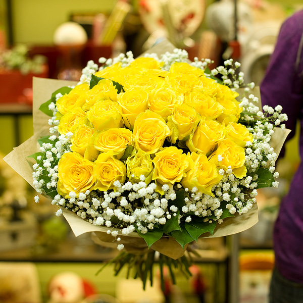 Букет из желтых роз в ореоле белой гипсофилы с декоративной зеленью в подарочной упаковке. По Вашему желанию цветовую гамму букета можно изменить, для этого звоните в наши салоны цветов или указывайте в разделе "комментарии для флориста" при заказе через интернет.