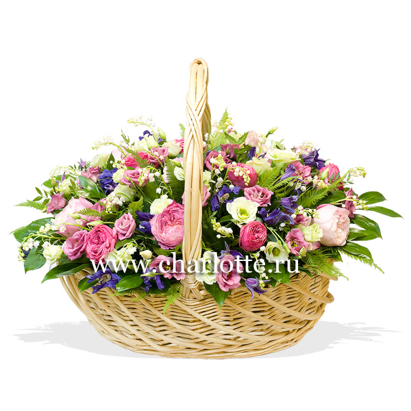 Корзина в розово-сиренево-белой гамме из ландышей, пионовидных роз, садовых клематисов, лизиантусов с декоративной зеленью в корзине. По Вашему желанию цветовую гамму композиции можно изменить, для этого звоните в наши салоны цветов или указывайте в разделе "комментарии для флориста" при заказе через интернет.