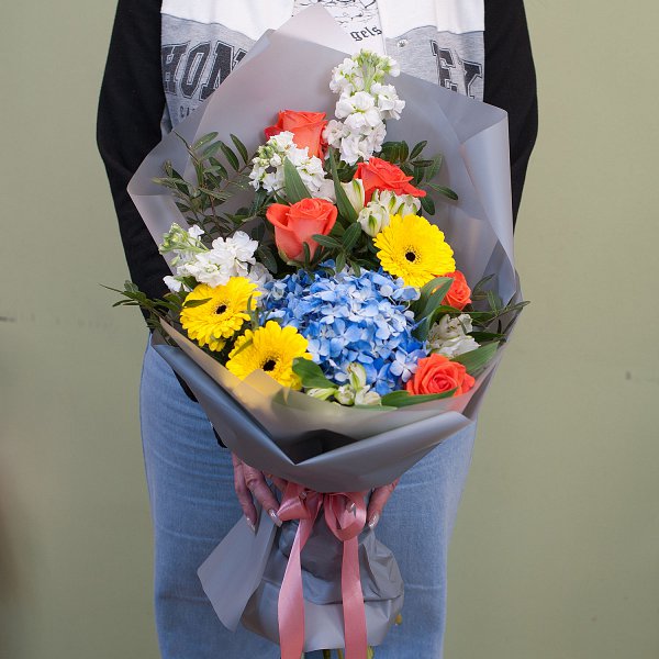 Букет состоит из 5 видов цветов: гортензии, розы, альстромерии, герберы мини и маттиолы. Такое разнообразие цветов создает неповторимый и яркий образ.