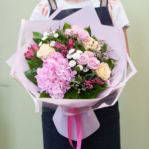 Букет состоит из 6 видов цветов: гортензии, хризантемы сантини, альстромерии, розы. Такое разнообразие позволяет создать уникальную композицию, которая будет радовать получателя своей красотой и свежестью.