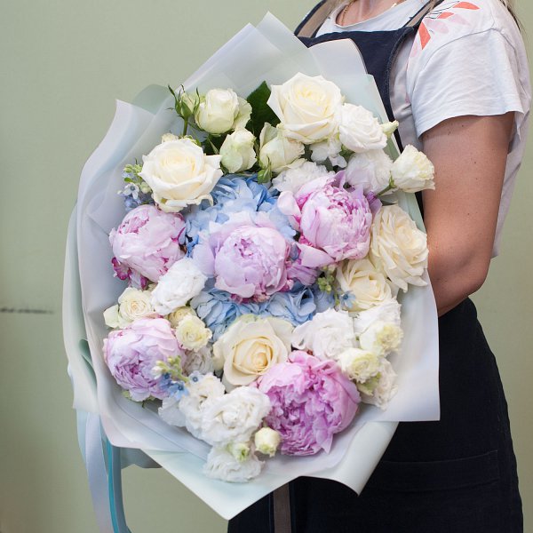 Букет состоит из 6 видов цветов, включая гортензию, пион, эустому, оксипелатум, розу и розу кустовую. Такое разнообразие цветов создает уникальную композицию, которая будет радовать глаз и вызывать восхищение.