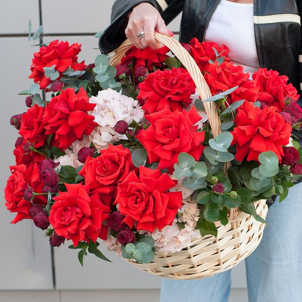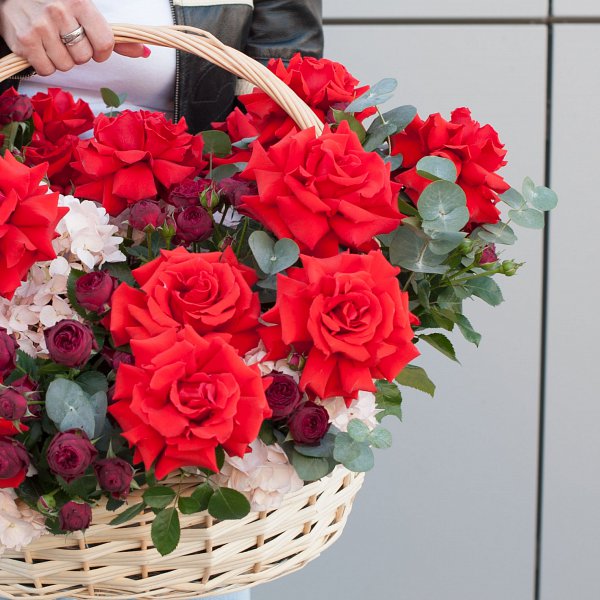 Букет состоит из роз, кустовых роз и гортензии, что придает ему неповторимый и яркий вид. Красные цветы символизируют любовь и страсть, а также выражают уважение и признательность.