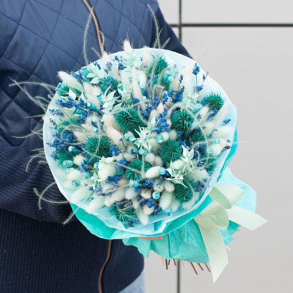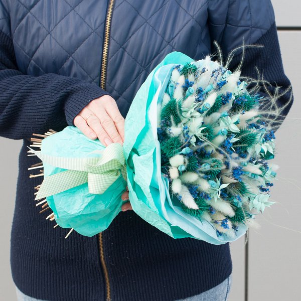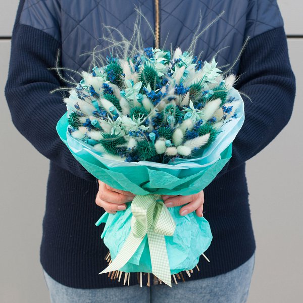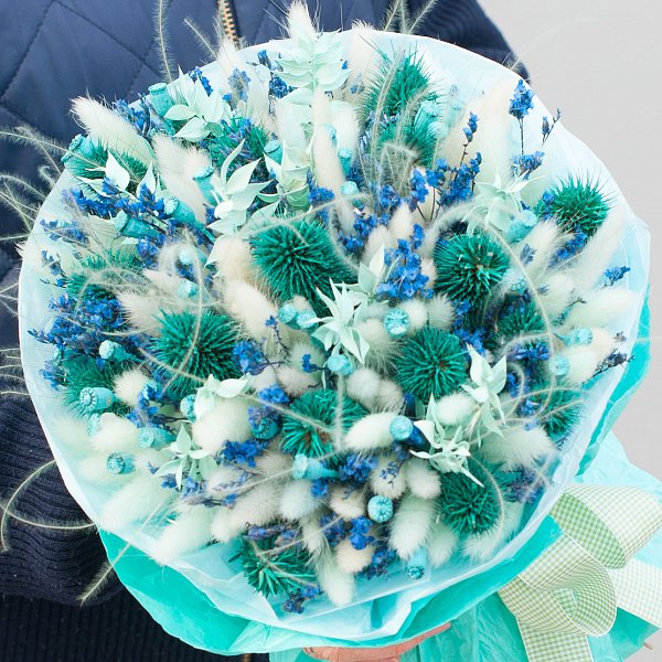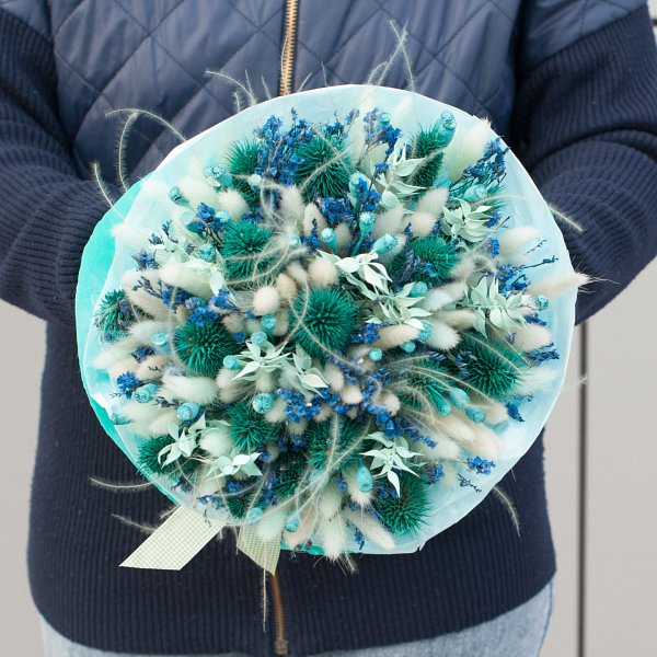 В состав букета входят такие виды сухоцветов, как лагурус, эрингиум и ковыль. Это придает букету объем и текстуру, делая его еще более привлекательным и живым.